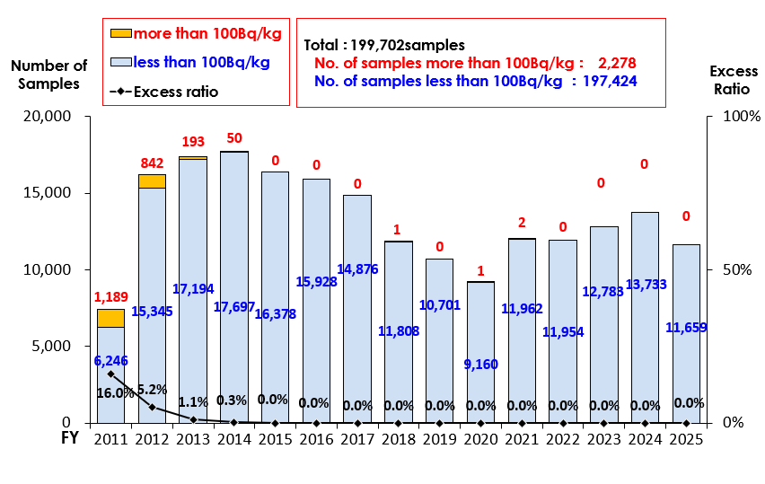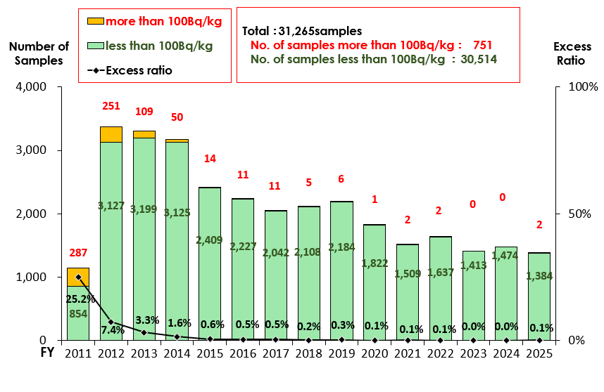 At a total of 159,419 fishery product samples has been monitored (as of January 27, 2021) since the FDNPS accident. The result represents a significant trend that the radioactive cesium excess ratio has decreased and recently very few fishery products exceed the Japanese maximum level (100Bq/kg).
