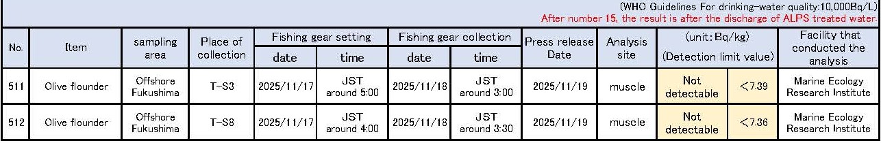 - Monitoring results of radionuclides in fisheries products conducted by Fisheries Research Agency(PDF : 607KB) (as of 6 November, 2025)
