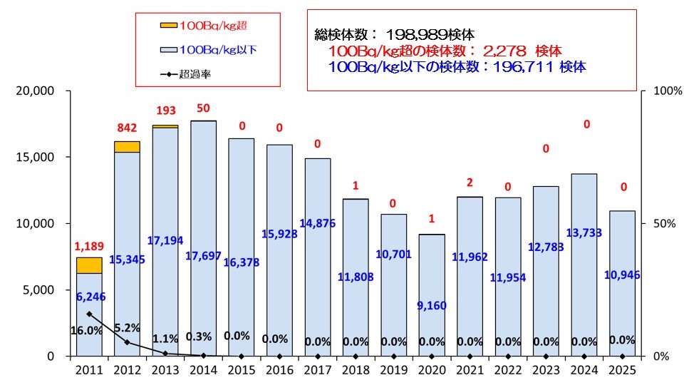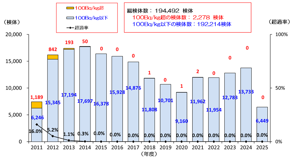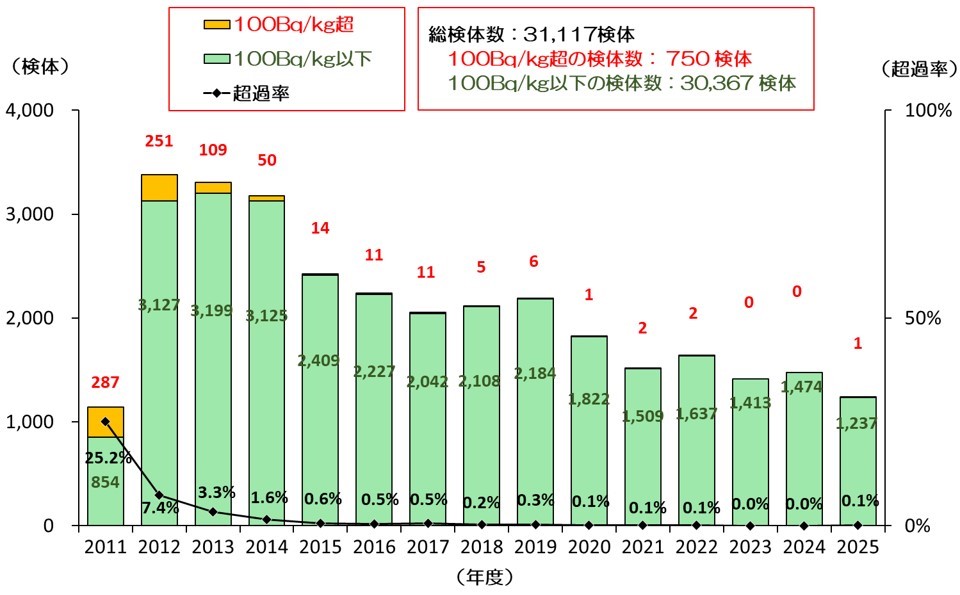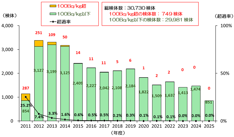 調査の結果、基準値(100 Bq/kg)を超える割合は事故からの時間の経過とともに低下する傾向にあります。