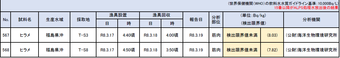 T-S3:緯度 37°27'30"N経度 141°04'44"ET-S8:緯度 37°23'00"N経度 141°04'44"E 世界保健機関(WHO)の飲料水水質ガイドライン基準:10,000Bq/L |