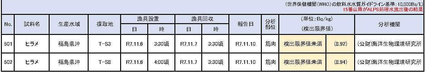 (株)東京電力福島第一原子力発電所からの放射性物質の放出による水産物への影響を調べるため、水産庁は、関係自治体及び関係業界団体等と連携し、福島県及び近隣県において、水産物のサンプリング調査をしています。