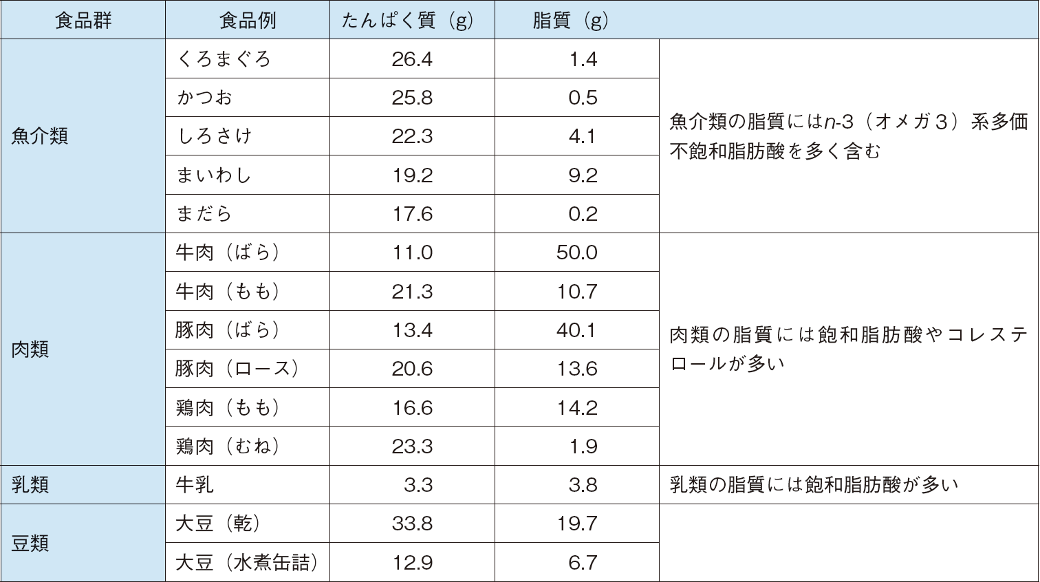 図表1-14 主な食品の100g当たりのたんぱく質・脂質含有量