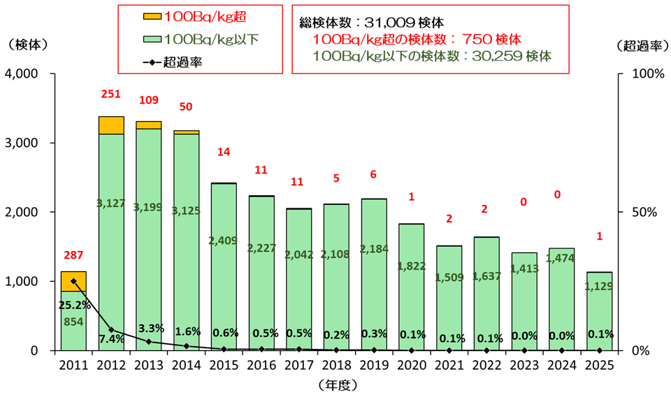 調査の結果、基準値(100Bq/kg)を超える割合は、過去3年間で1検体のみとなっています。