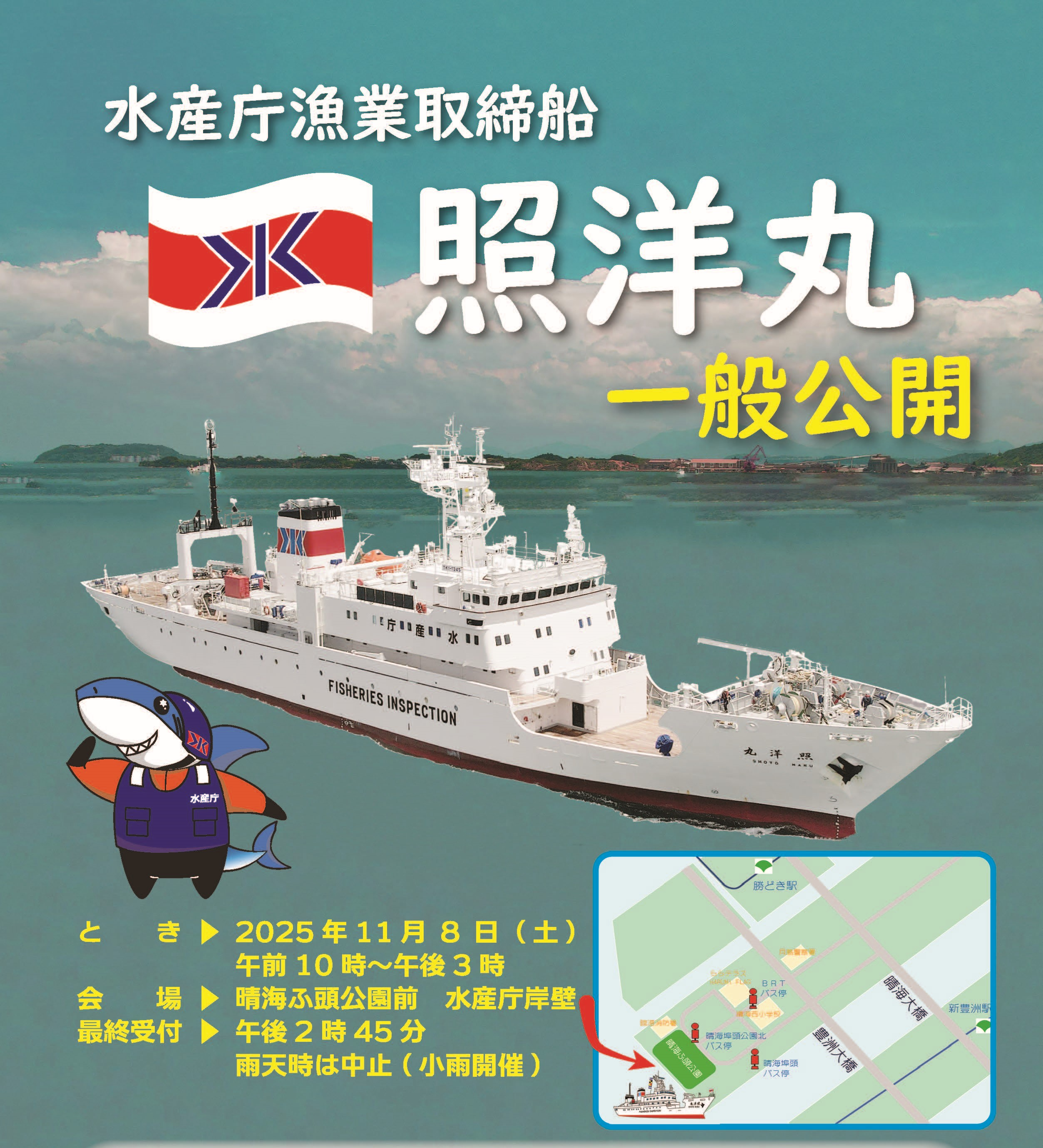 漁業調査船として建造された初代「照洋丸(しょうようまる)」の起工から70周年を迎えるなか、漁業取締船として活動中の3代目となる「照洋丸」が、令和7年11月8日(土曜日)、晴海ふ頭H3バース(晴海ふ頭公園正面の岸壁)にて一般公開を開催します。普段は見ることのできない漁業取締船の船内施設の見学、「照洋丸」が従事している漁業取締活動の紹介、更に初代「照洋丸」の竣工当時のパンフレットや写真等の貴重な資料の展示も行われます。