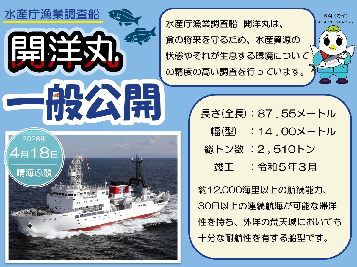 水産庁は、漁業調査船「開洋丸(かいようまる)」の一般公開を実施し、普段は入ることのできない船上および船内施設の見学、漁業調査業務等の紹介を行います。みなさまのお越しを心よりお待ちしています。