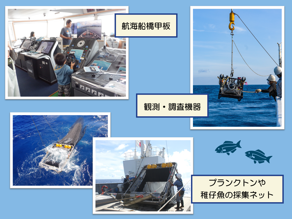 水産資源の持続的な利用のため、また、食の将来を守るために行っている「開洋丸」の調査は、近海から遠洋までの広い海域において行われることから、日頃なかなかその姿をみなさまにお見せすることができません。そこで、この機会に「開洋丸」の船上および船内施設、調査機器等をご観覧いただくとともに、漁業調査業務の意義や魅力についてご紹介します。