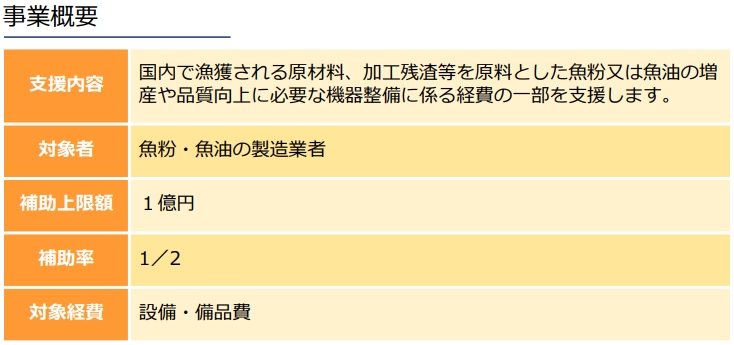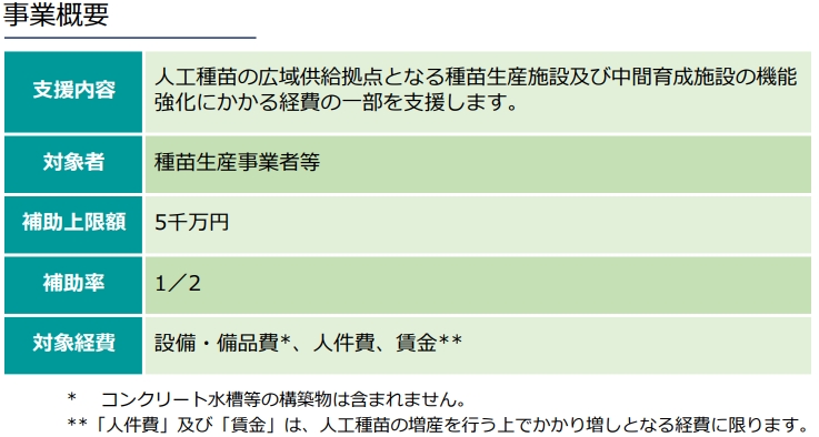 飼料原料価格の高騰や天然種苗の不漁などの新たなリスクの下でも持続的に養殖生産を行うことができるよう、国産飼料原料への転換に対する取組、天然由来の種苗から人工種苗への転換に対する取組、生産コストの低減に資する取組を支援します。事業の内容